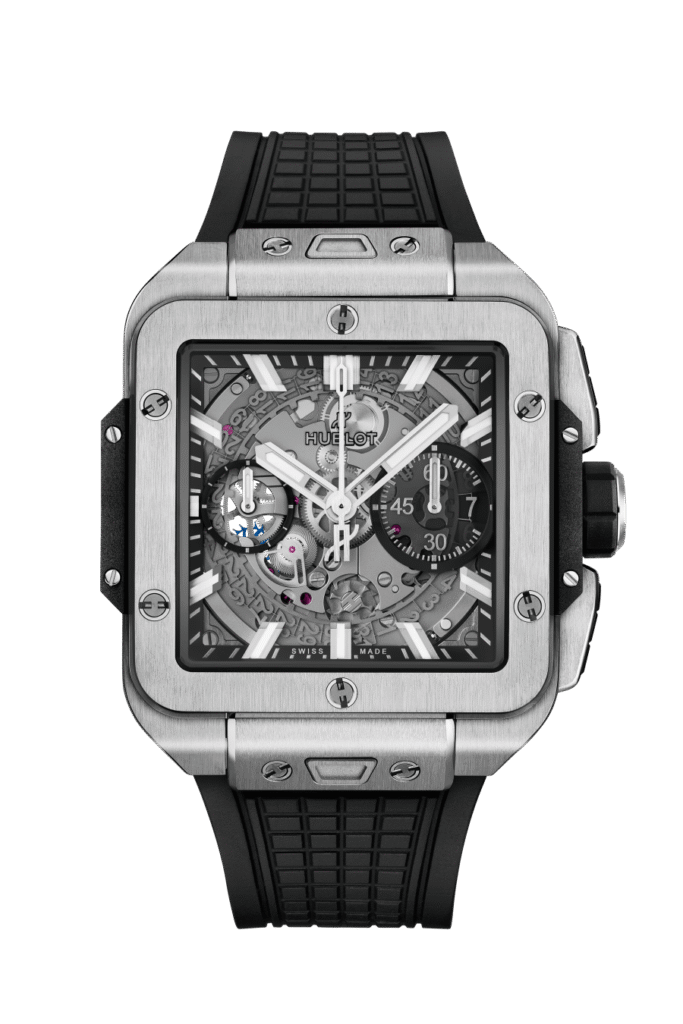 The Square Bang is Hublot’s newest major design experiment, translating the Big Bang’s layered construction and exposed screws into a square case. While square watches are not new, Hublot’s approach is unmistakably contemporary and architectural.
